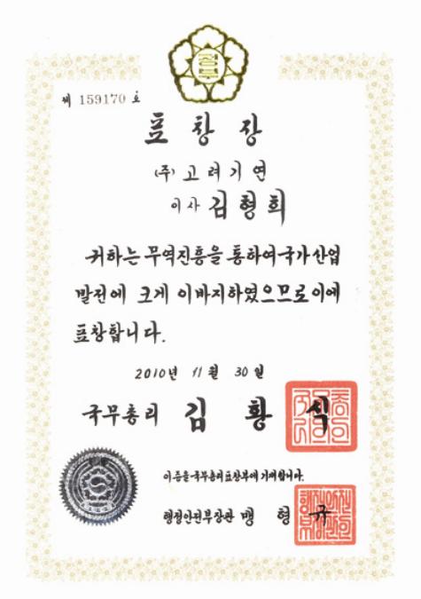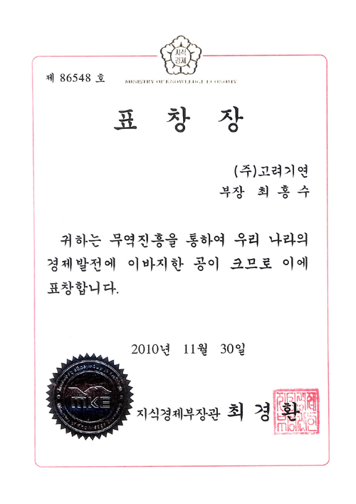 제47회 무역의 날에 본사가 무역 진흥의 공로를 인정받아 일백만불탑 포상 외 국무총리표창, 지경부장관표창을