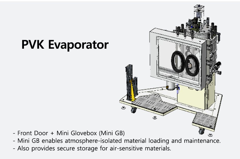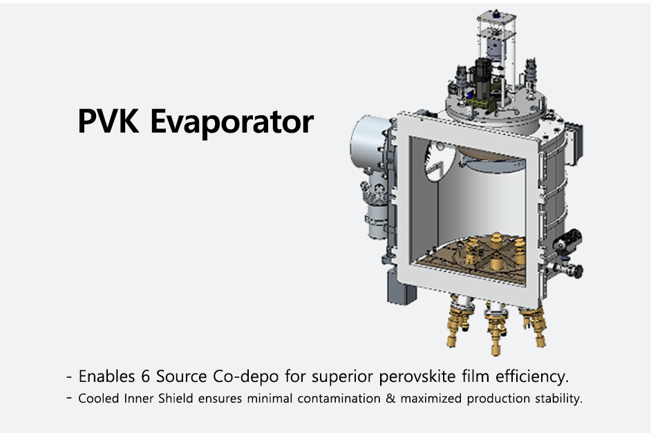 - 페로브스카이트 증착 챔버는 유기할라이드 전용 증착 챔버 (MAI, FAI) + 할로겐화금속 전용 증착 챔버 (PbI₂, SnI₂) 로 구성