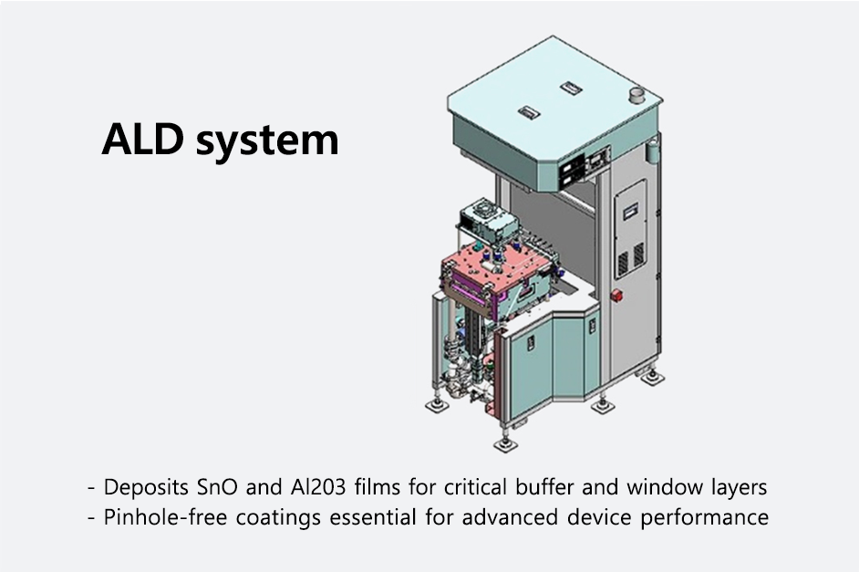 파장을 흡수할 수 있는 페로브스카이트 태양광 클러스터 장비 와, 800 ~ 1100nm 파장을 흡수 할 있는 CIGS 클러스터 장비로 구성 되어있습니다.