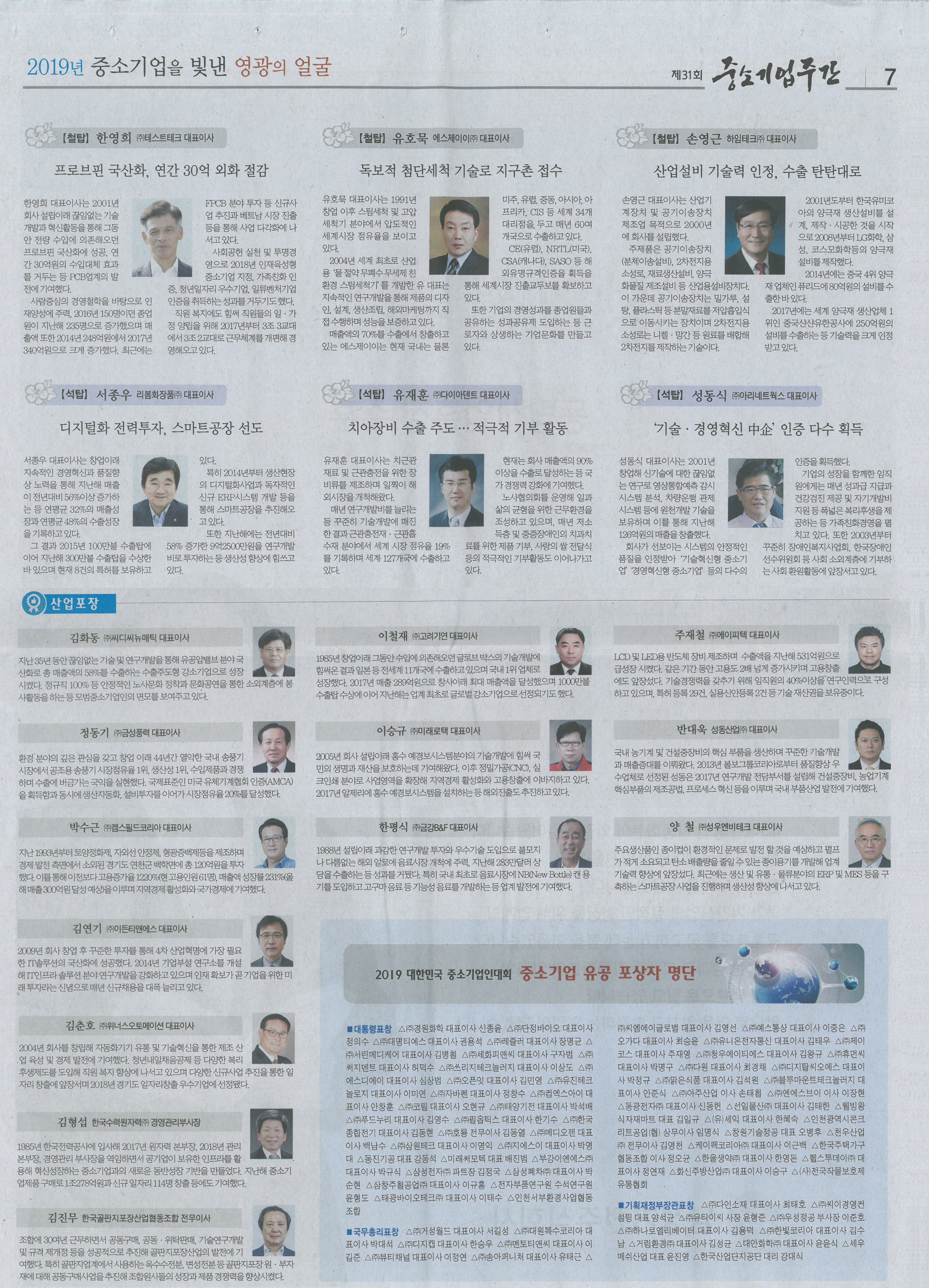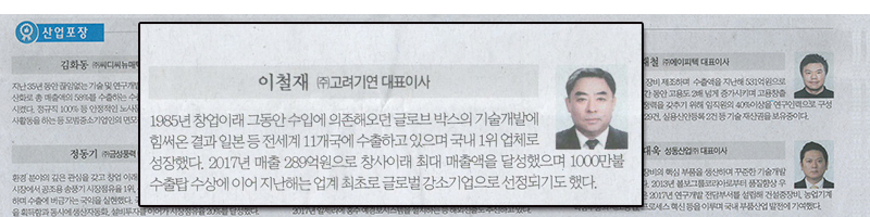 작성일 : 19-05-24 11:41 경축! 2019 중소기업인의 날 (주)고려기연 대표이사 산업 포장상 수상! 글쓴이 : KOREAKIYON 조회 : 8,181 이메일 : koreakiyon@glovebox.co.kr 2019 05.14일 중소기업인의 날 (주)고려기연 이철재 사장님께서 산업포장을 수상하셨습니다. 이와 함께 관리팀 이사는 중소벤처기업부 장관상을 받게 되었음을 같이 알려드립니다. 축하드립니다!!