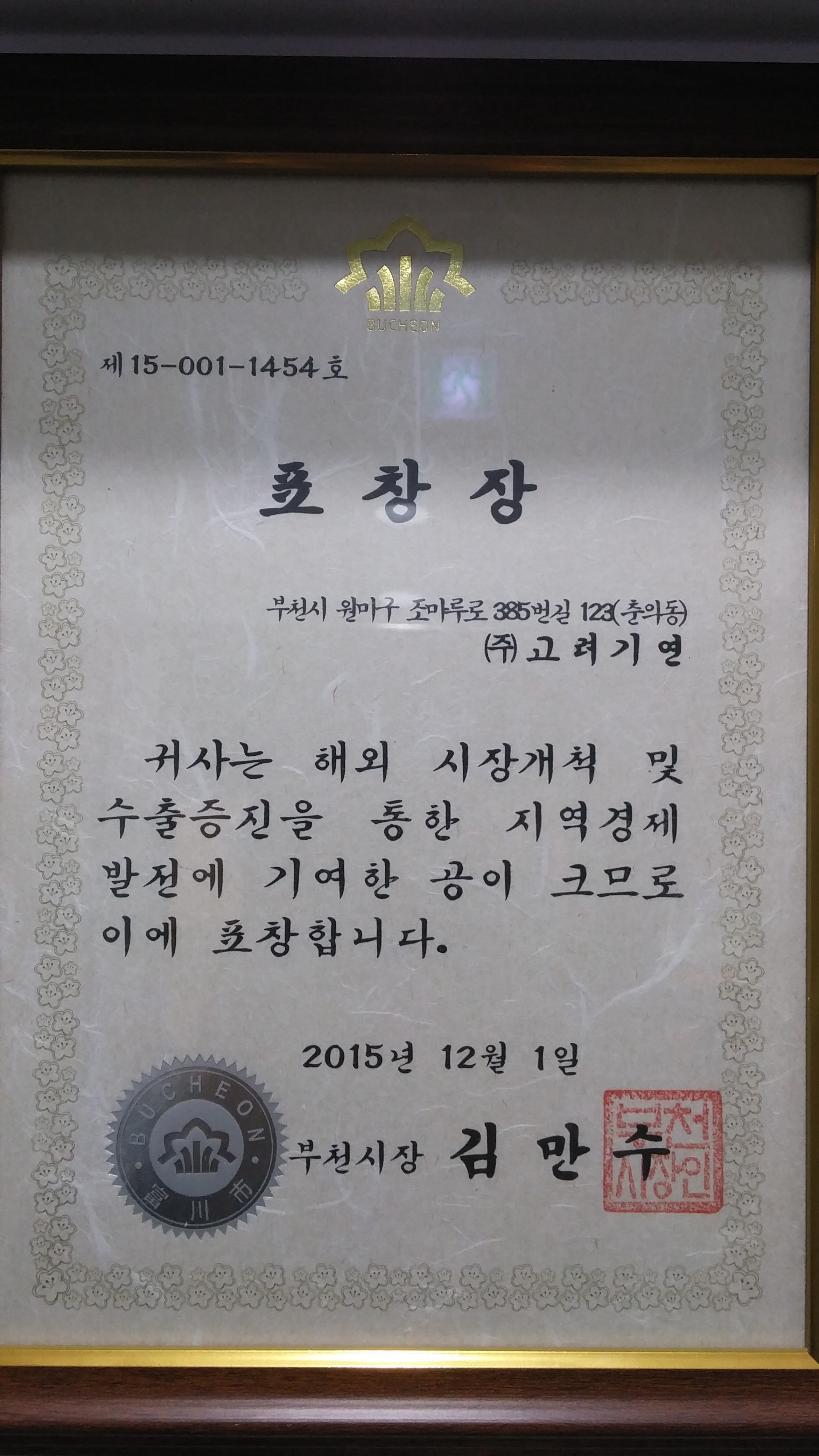 작성일 : 15-12-10 13:32 부천시 수출 유공업체 포상 글쓴이 : 고려기… 조회 : 8,938 이메일 : koreakiyon@glovebox.co.kr 2015.12.01일 부천시 수출 유공업체에 당사가 선정되어, 부천시장상을 받게 되었습니다. 이는 모두 고객분들이 당사에 많은 관심과 애정을 가져주신 덕분이라고 생각이 듭니다.더욱 노력하는 (주)고려기연이 되겠습니다. 감사합니다.